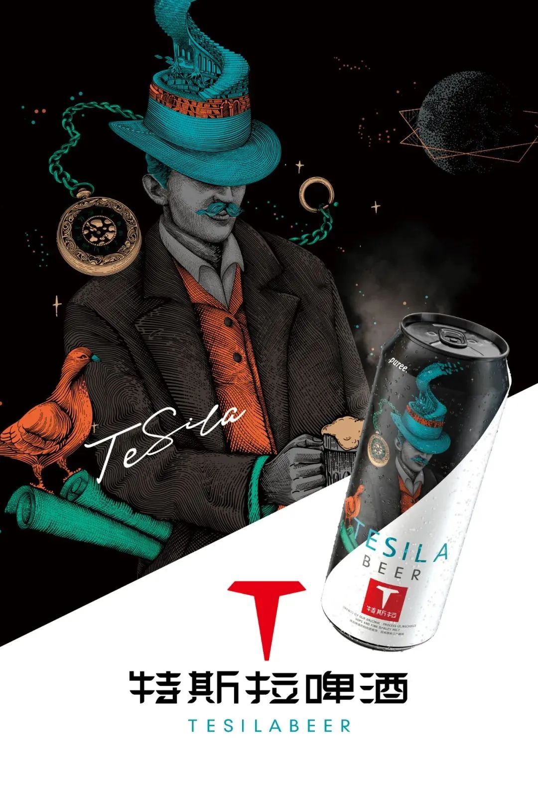 我們注意到,特斯拉啤酒去年還設(shè)計了一款新包裝。在創(chuàng)作過程還借助科學(xué)家“特斯拉”為視覺原型再創(chuàng)作,以此轉(zhuǎn)化為品牌專屬視覺,暗示靈感來自科學(xué)家“特斯拉”。