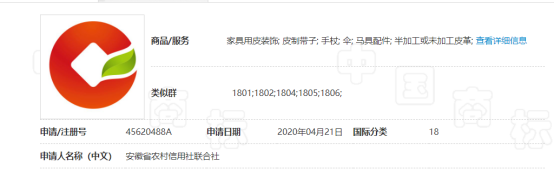 因認(rèn)為安徽省農(nóng)村信用社聯(lián)合社的一枚圖形商標(biāo)(第45620488A號)與其商標(biāo)近似且侵犯其著作權(quán),在該商標(biāo)公告期內(nèi),中國建設(shè)銀行股份有限公司對其提出異議請求。商標(biāo)局審理認(rèn)為:被異議商標(biāo)指定使用商品與異議人引證商標(biāo)核定使用服務(wù)不屬于類似商品或服務(wù),因此雙方商標(biāo)未構(gòu)成使用于類似商品或服務(wù)上的近似商標(biāo)。但被異議人將與異議人享有著作權(quán)的作品相近似的圖案作為商標(biāo)申請注冊,已構(gòu)成對異議人著作權(quán)的損害,故商標(biāo)局決定:第45620488A號“圖形”商標(biāo)不予注冊。小編查詢,目前該枚商標(biāo)進(jìn)入不予注冊復(fù)審流程。