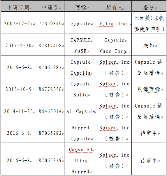 原告Uncommon,LLC于2015年12月向美國伊利諾伊北區(qū)聯(lián)邦法院對被告SPIGEN,INC.提起了商標侵權訴訟;被告則向法院申請撤銷原告的capsule商標。