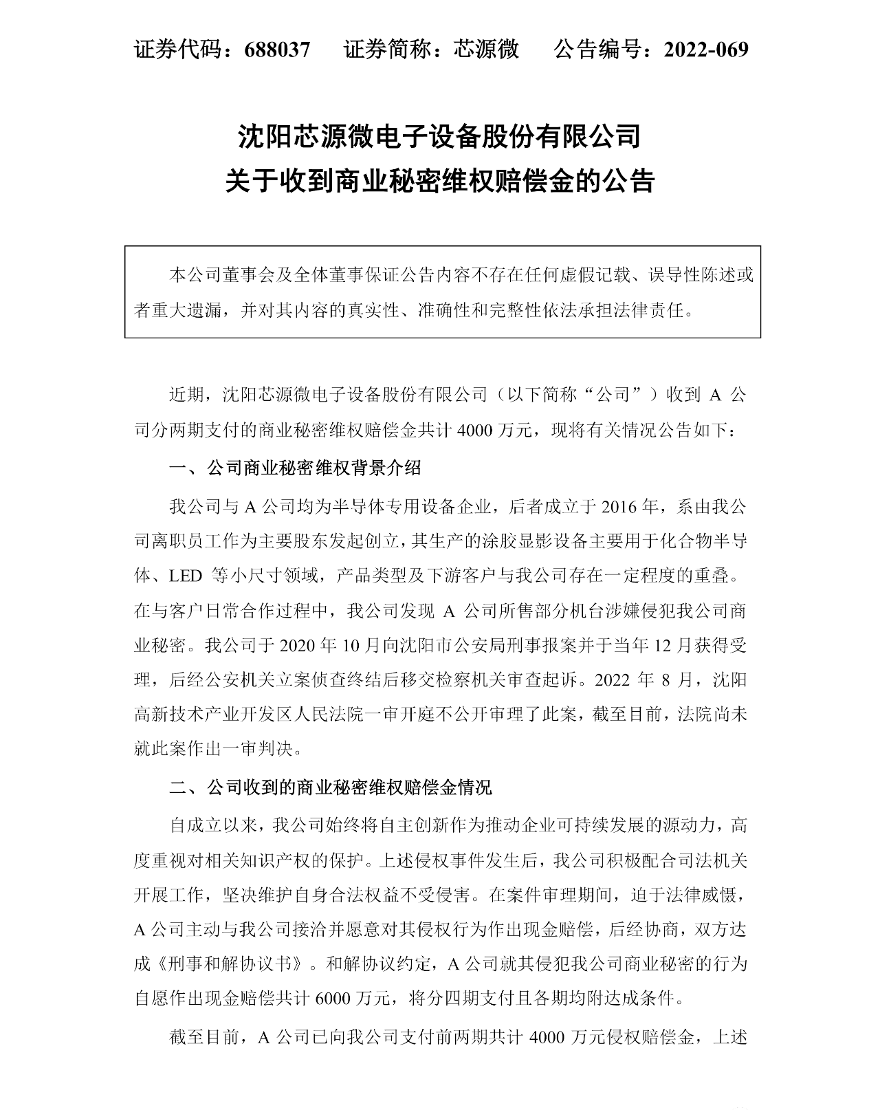 近日,芯源微發(fā)公告稱,公司收到商業(yè)秘密維權(quán)賠償金4000萬元,雙方約定總共賠償6000萬元,后續(xù)2000萬元要達(dá)到一定條件后進(jìn)行支付。