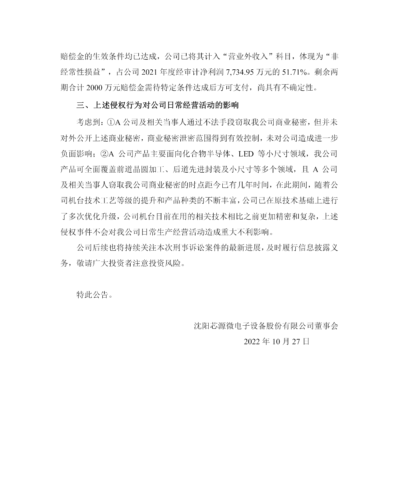 在與客戶日常合作過程中,公司發(fā)現(xiàn)A公司所售部分機臺涉嫌侵犯公司商業(yè)秘密。公司于2020年10月向沈陽市公安局刑事報案并于當(dāng)年12月獲得受理,后經(jīng)公安機關(guān)立案偵查終結(jié)后移交檢察機關(guān)審查起訴。