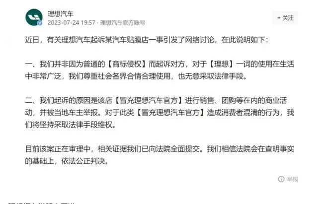7月24日晚上,理想汽車在官方賬號發(fā)文說明,表示不會影響生活中對“理想”一詞的合情合理使用。
