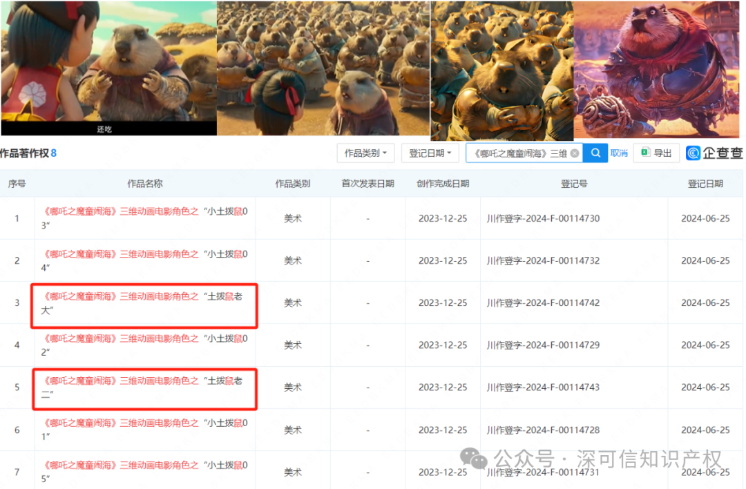 無(wú)論是主角哪吒與敖丙,還是配角如帥爹敖光、嫵媚的敖閏,甚至是影片中呆萌無(wú)害的土撥鼠,都進(jìn)行了著作權(quán)登記。此外,石磯娘娘、無(wú)量仙尊等角色及其變形形態(tài),也都納入了著作權(quán)保護(hù)的范圍。