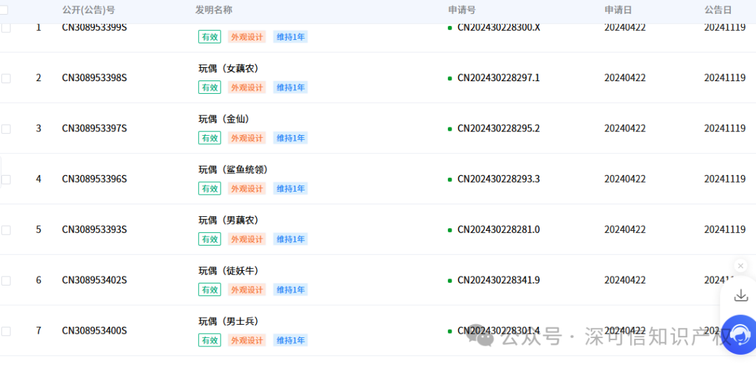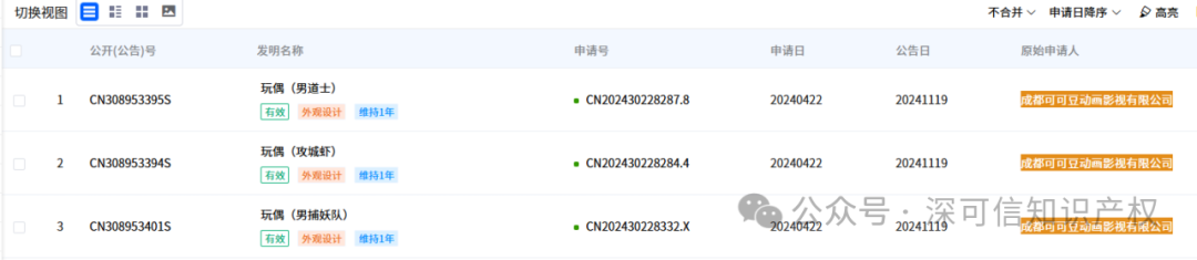目前,成都可可豆動(dòng)畫(huà)與成都自在境界文化兩家出品公司,已經(jīng)成功公開(kāi)了多項(xiàng)與電影角色玩偶設(shè)計(jì)相關(guān)的外觀專(zhuān)利。這些專(zhuān)利涵蓋了多個(gè)深受觀眾喜愛(ài)的角色,如玉虛宮捕妖隊(duì)的成員、嘲笑哪吒的小道士等。有效防止了未經(jīng)授權(quán)的周邊產(chǎn)品制作與銷(xiāo)售行為。這些角色的外觀專(zhuān)利在2024年4月22日正式提交申請(qǐng),并在同年年底成功獲得了授權(quán)公告。