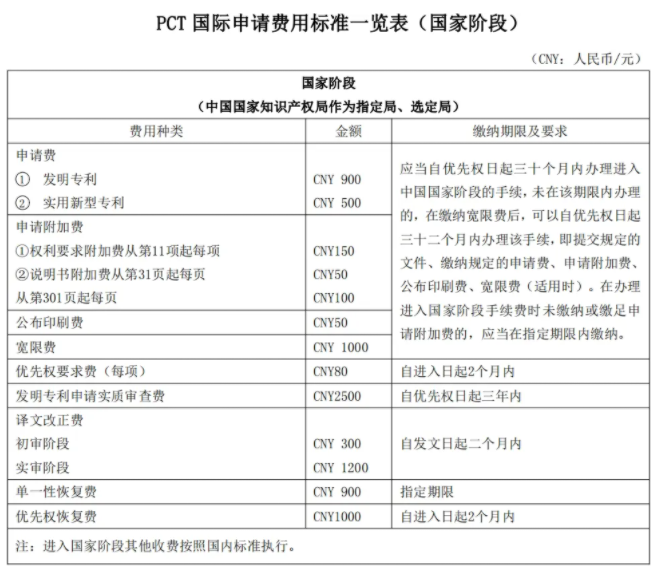 PCT國(guó)家階段(中國(guó)國(guó)家知識(shí)產(chǎn)權(quán)局作為指定局、選定局)繳納的費(fèi)用包括申請(qǐng)費(fèi)、申請(qǐng)附 加費(fèi)、公布印刷費(fèi)、優(yōu)先權(quán)要求費(fèi)、寬限費(fèi)、發(fā)明專利申請(qǐng)實(shí)質(zhì)審查費(fèi)、譯文改正費(fèi)、單一性恢復(fù)費(fèi)、優(yōu)先權(quán)恢復(fù)費(fèi)。進(jìn)入國(guó)家階段其他收費(fèi)按照國(guó)內(nèi)標(biāo)準(zhǔn)執(zhí)行。