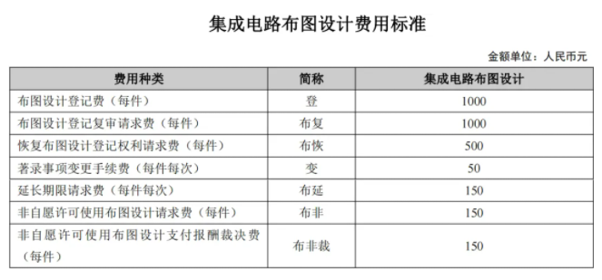 集成電路布圖設(shè)計(jì)的費(fèi)用種類包括布圖設(shè)計(jì)登記費(fèi)、布圖設(shè)計(jì)登記復(fù)審請(qǐng)求費(fèi)、恢復(fù)布圖設(shè)計(jì)登記權(quán)利請(qǐng)求費(fèi)、著錄事項(xiàng)變更手續(xù)費(fèi)、延長(zhǎng)期限請(qǐng)求費(fèi)、非自愿許可使用布圖設(shè)計(jì)請(qǐng)求費(fèi)、非自愿許可使用布圖設(shè)計(jì)支付報(bào)酬裁決費(fèi)。