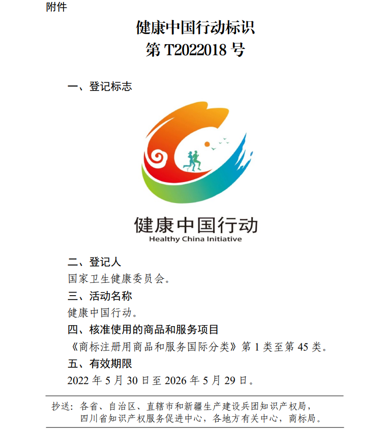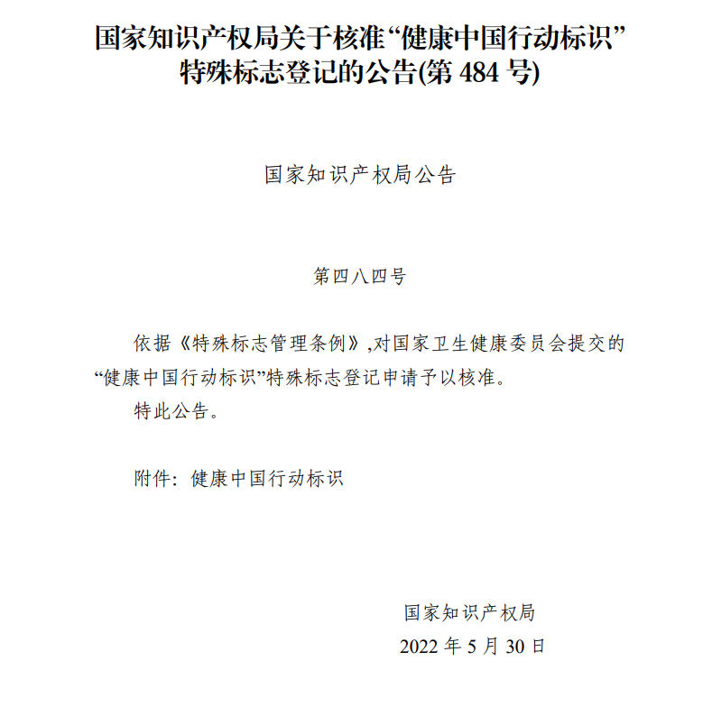 國家知識產(chǎn)權(quán)局關(guān)于核準“健康中國行動標識”特殊標志登記的公告