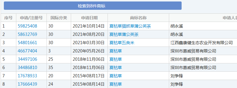 于中國(guó)商標(biāo)網(wǎng)以“夏枯草”為名搜索,8個(gè)關(guān)聯(lián)商標(biāo)的主體申請(qǐng)記錄中,并無(wú)可口可樂(lè)方面身影。且只有兩個(gè)商標(biāo)注冊(cè)成功。而名為“夏枯草蒲公英茶”、“夏枯草貓抓草蒲公英茶”等申請(qǐng)范圍涉及茶飲料相關(guān)的商標(biāo),目前仍在等待實(shí)質(zhì)審查中。