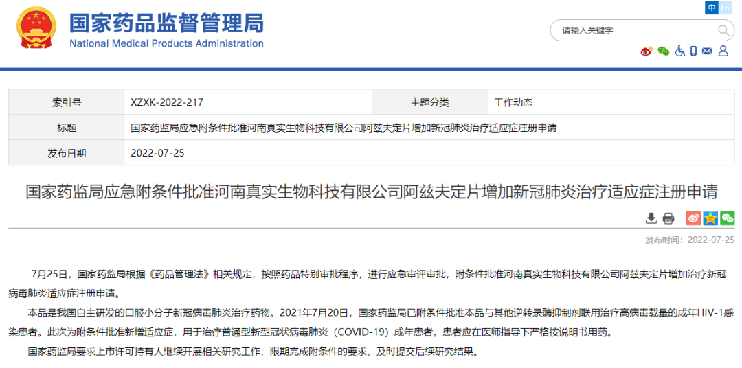 據(jù)國家藥監(jiān)局網(wǎng)站消息,7月25日,國家藥監(jiān)局根據(jù)《藥品管理法》相關(guān)規(guī)定,按照藥品特別審批程序,進行應(yīng)急審評審批,附條件批準河南真實生物科技有限公司阿茲夫定片增加治療新冠病毒肺炎適應(yīng)癥注冊申請。