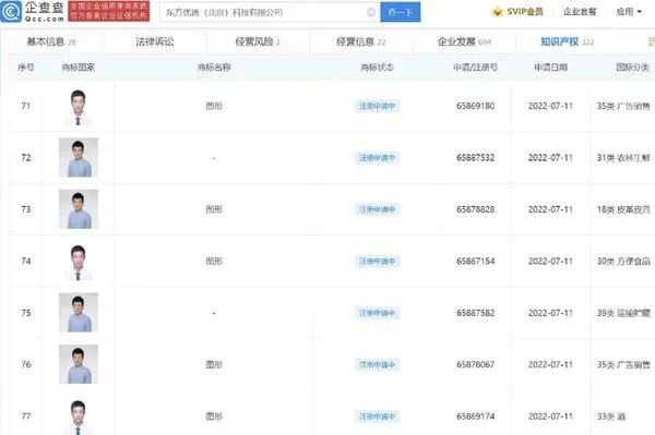 企查查 APP 顯示,近日,東方優(yōu)選(北京)科技有限公司申請(qǐng)注冊(cè)多個(gè)東方臻選直播間主播肖像商標(biāo),包括 " 董宇輝、孫佳琦、孫楚涵 " 等人肖像。據(jù)悉,這些商標(biāo)的國際分類包含教育娛樂、廣告銷售、農(nóng)林生鮮、辦公用品等,目前商標(biāo)進(jìn)度為:注冊(cè)申請(qǐng)中。