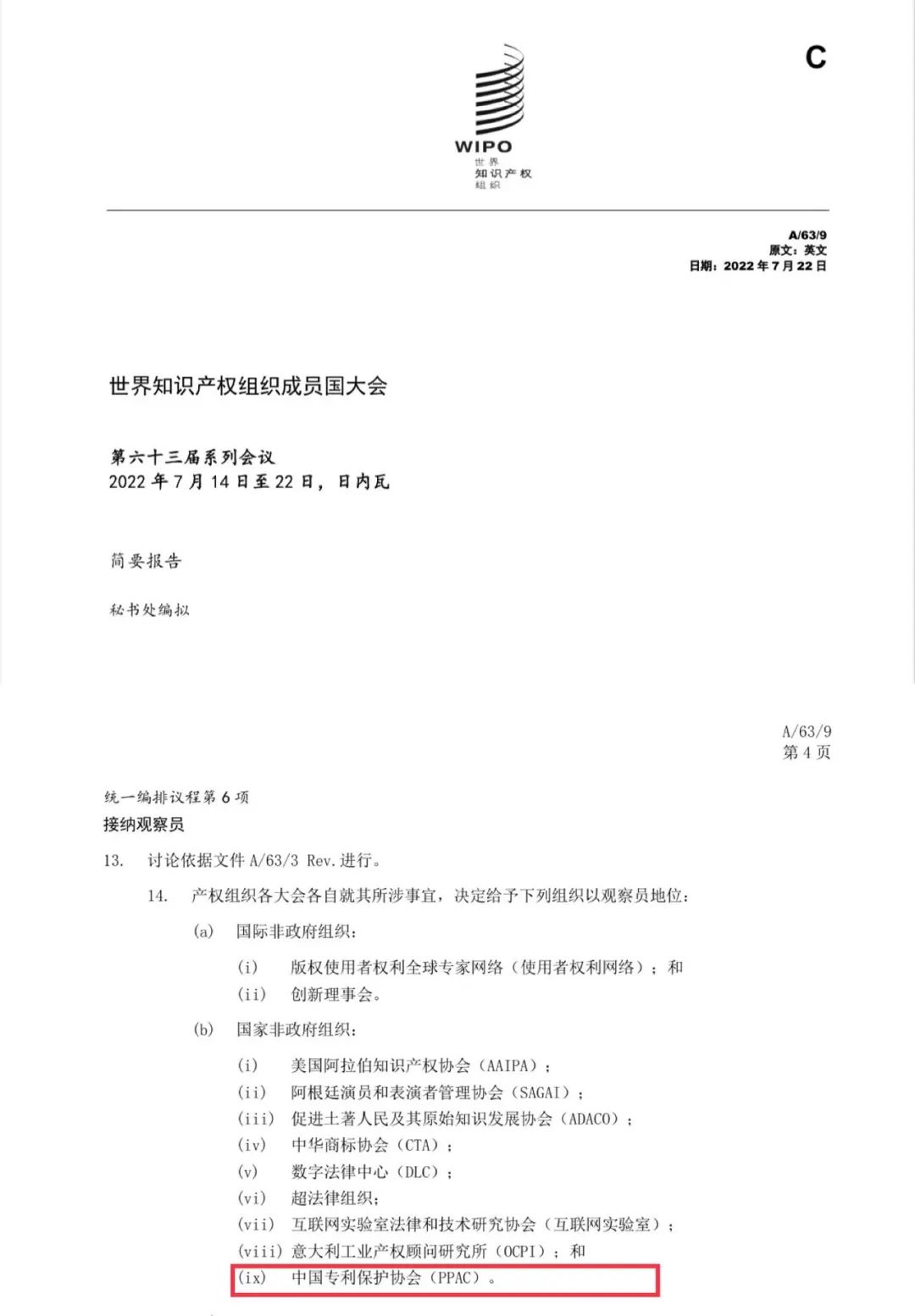 2022年7月, 世界知識(shí)產(chǎn)權(quán)組織(WIPO)成員國(guó)大會(huì) 第63屆系列會(huì)議以實(shí)體加線上的混合模式 在瑞士日內(nèi)瓦召開(kāi), 會(huì)議審議通過(guò) 中國(guó)專利保護(hù)協(xié)會(huì) 成為世界知識(shí)產(chǎn)權(quán)組織觀察員。