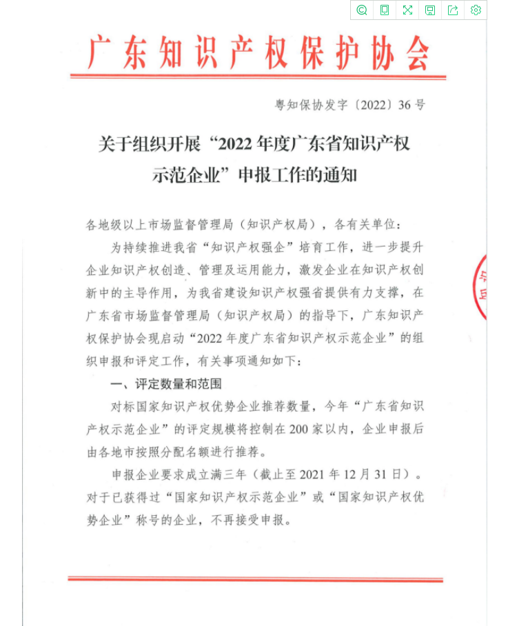 通知正文:粵知保協(xié)發(fā)字〔2022〕36號(hào)-關(guān)于組織開展“2022年度廣東省知識(shí)產(chǎn)權(quán)示范企業(yè)”申報(bào)工作的通知