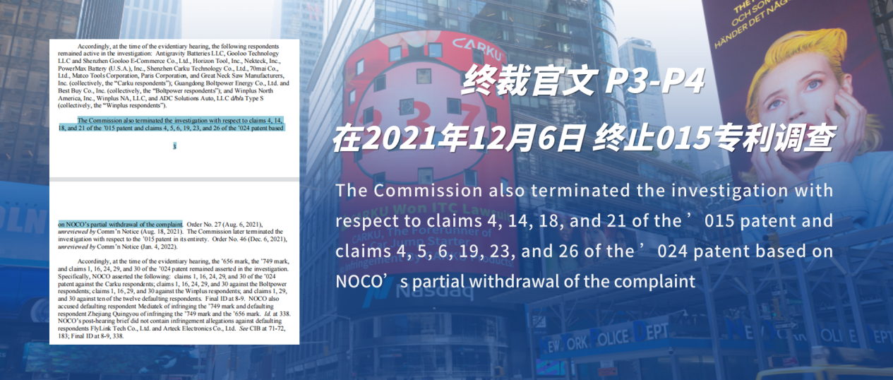 這一無效裁決使得美國NOCO公司發(fā)起“337調(diào)查”不久后,美國NOCO公司主動撤回了015專利的調(diào)查。