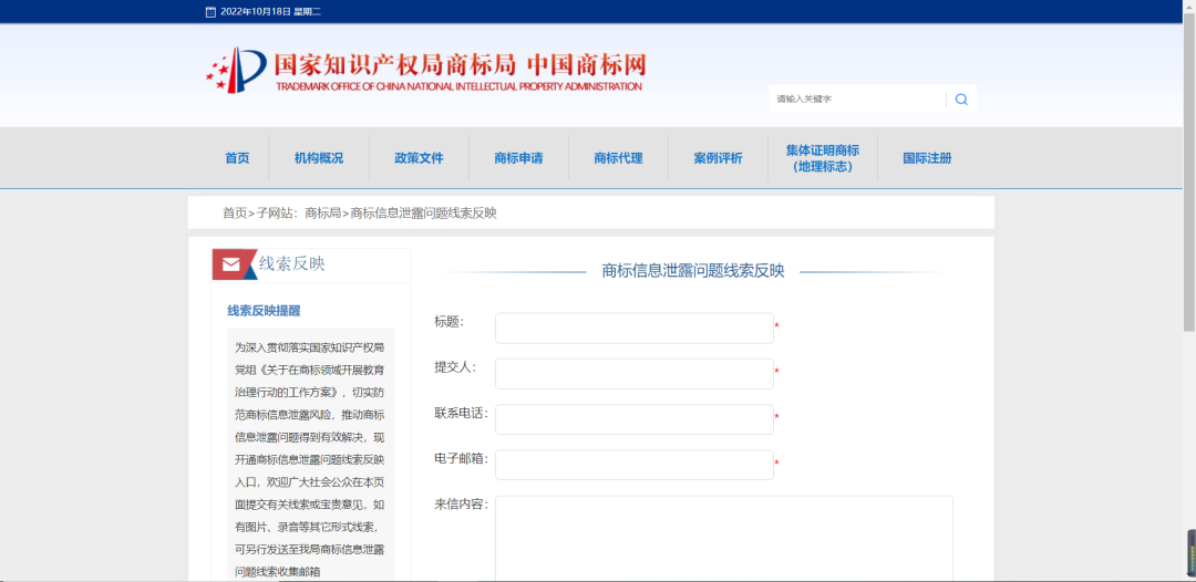 歡迎廣大社會(huì)公眾在本頁面提交有關(guān)線索或?qū)氋F意見。如有圖片、錄音等其它形式線索,可另行發(fā)送至商標(biāo)局商標(biāo)信息泄露問題線索收集郵箱sbxxwt@cnipa.gov.cn。