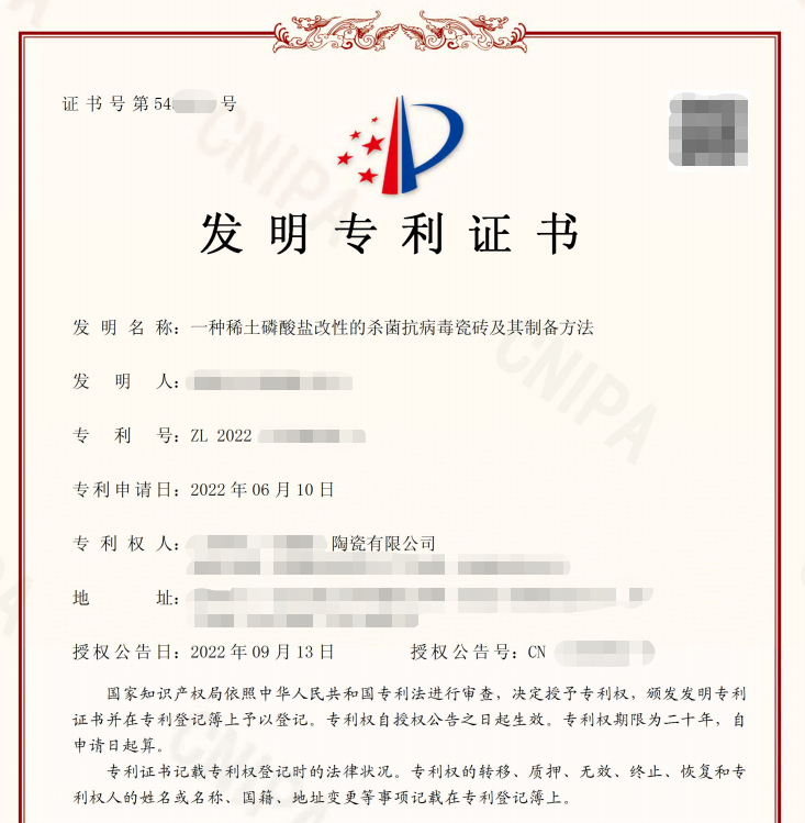 近日,由深圳市深可信專利代理《一種具有高韌性的瓷磚及其制備方法》、《一種稀土磷酸鹽改性的殺菌抗病毒瓷磚及其制備方法》、《一種超疏水陶瓷磚及其制備方法》的組合物發(fā)明專利順利通過國家知識產(chǎn)權(quán)局審查,獲得國家發(fā)明專利授權(quán)。