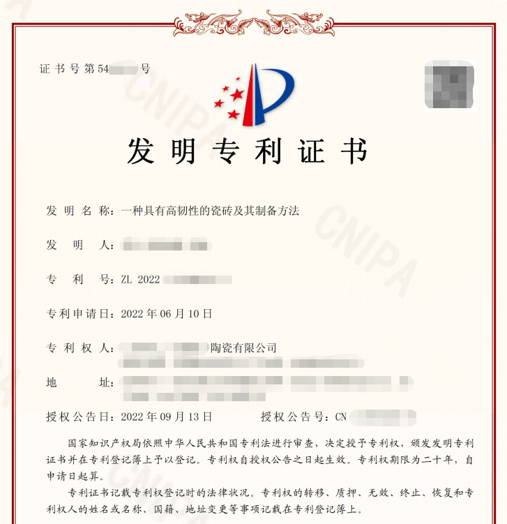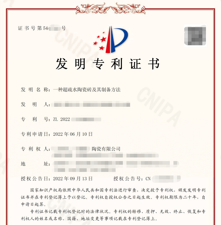 近日,深圳深可信專利代理&某瓷磚公司的“組合物發(fā)明專利”《一種具有高韌性的瓷磚及其制備方法》、《一種稀土磷酸鹽改性的殺菌抗病毒瓷磚及其制備方法》、《一種超疏水陶瓷磚及其制備方法》走快速預(yù)審,順利通過國家知識產(chǎn)權(quán)局審查,僅歷時三個月就獲得發(fā)明專利授權(quán)取得證書!下方??請下滑動查看更多哦~