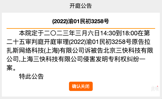 ??重慶法院公眾服務網顯示,拉扎斯網絡科技(上海)有限公司與北京三快科技有限公司、上海三快科技有限公司相關侵害發(fā)明專利權糾紛一案定于3月6日開庭,