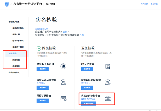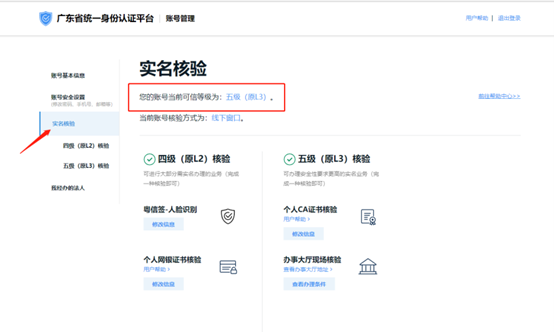 答:進(jìn)入廣東政務(wù)服務(wù)網(wǎng)(http://www.gdzwfw.gov.cn),使用賬號(hào)登錄后點(diǎn)擊右上角【用戶名稱】→【賬戶管理】→【實(shí)名核驗(yàn)】中,查看目前可信等級(jí)以及了解對(duì)應(yīng)等級(jí)進(jìn)行核驗(yàn)升級(jí)的流程 。