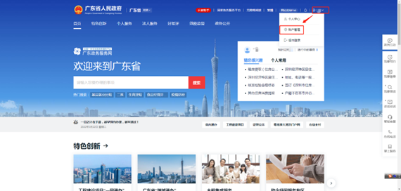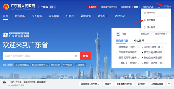 1.1 使用賬號(hào)登錄廣東政務(wù)服務(wù)網(wǎng),點(diǎn)擊用戶名(右上角)--賬戶管理進(jìn)入賬戶管理頁面。