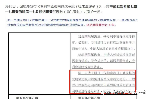 1、同樣的發(fā)明創(chuàng)造既申請實(shí)用新型又申請發(fā)明的,發(fā)明專利一般延遲4年審查;