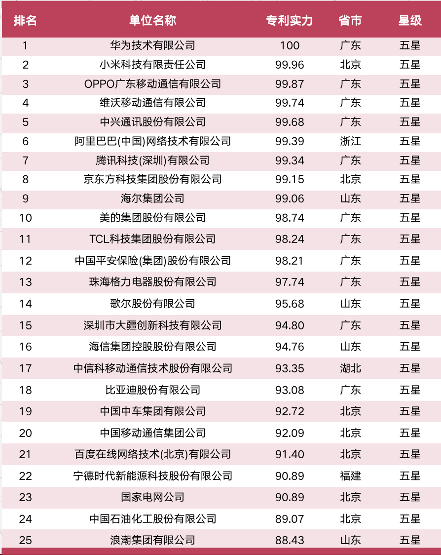 榜單分析對象為中國工商局注冊的企業(yè),數(shù)據(jù)范圍包括中國發(fā)明及實用新型專利,以專利價值平均值、有效發(fā)明和實用新型專利總數(shù)、發(fā)明人數(shù)、PCT數(shù)量、申請持續(xù)時間等分析指標(biāo),評選出“2022年中國企業(yè)專利實力500強榜單”,其中華為、小米、OPPO、維沃移動、中興通訊、阿里巴巴(中國)、騰訊、京東方、海爾、美的等榮列前十強。