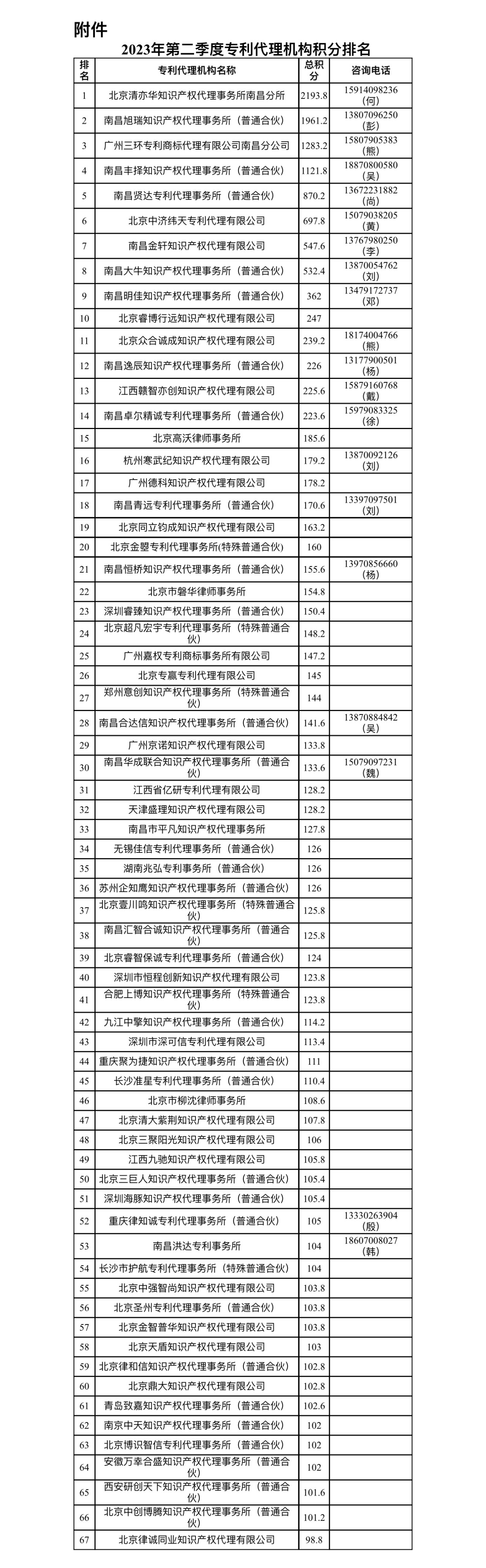 附件:2023年第二季度專(zhuān)利代理機(jī)構(gòu)積分排名