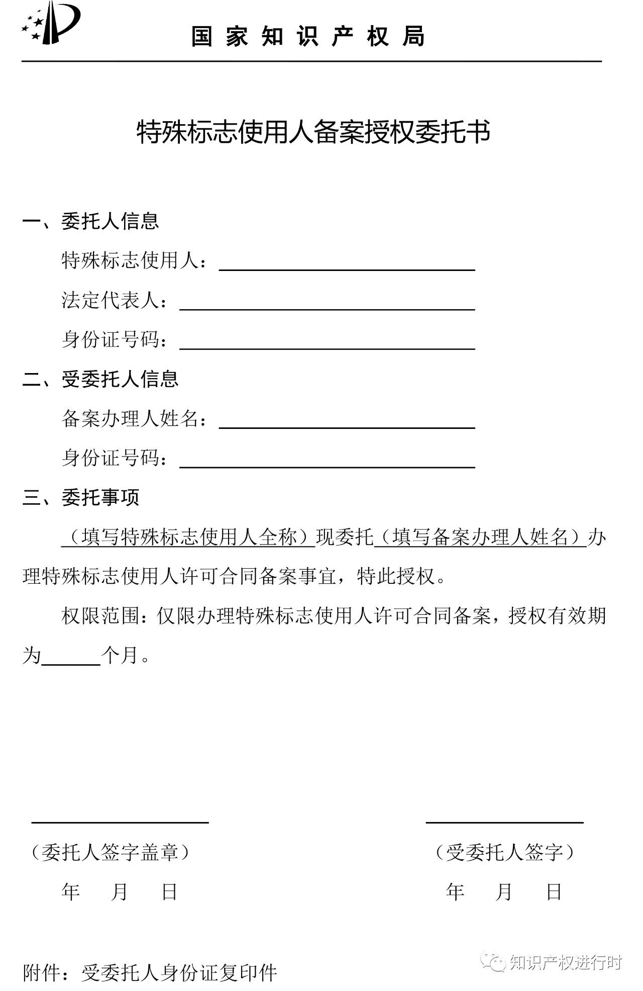 特殊標志使用人辦理特殊標志許可合同備案手續(xù)的,應當提交以下文件(紙質蓋章件或電子掃描件一份):