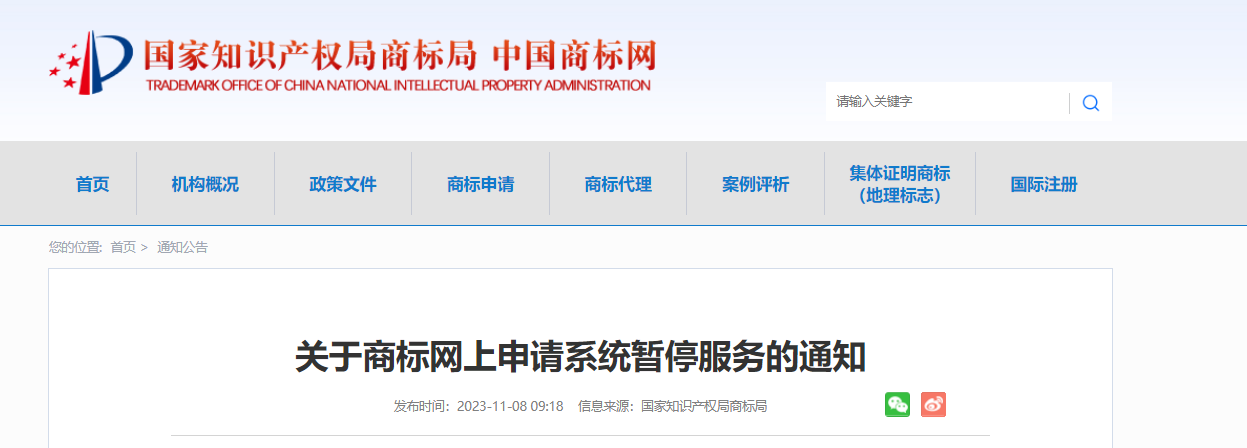 國知局:關(guān)于商標(biāo)網(wǎng)上申請系統(tǒng)暫停服務(wù)的通知