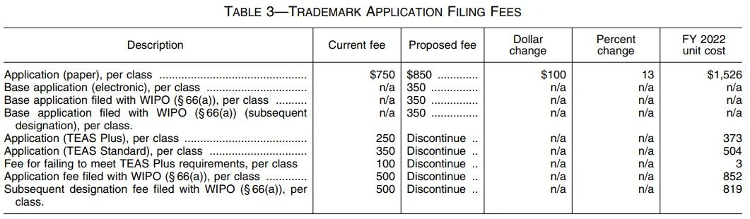 其中,規(guī)范申請(qǐng)(TEAS Plus)和非規(guī)范申請(qǐng)(TEAS Standard),將統(tǒng)一調(diào)整為350美元/類。相當(dāng)于每類美標(biāo)的成本都要增加100美元,漲幅高達(dá)40%。此外,美國專利商標(biāo)局提議使用一個(gè)單一的電子申請(qǐng)?zhí)峤贿x項(xiàng),將不再區(qū)分規(guī)范申請(qǐng)(TEAS Plus)和非規(guī)范申請(qǐng)(TEAS Standard)。
