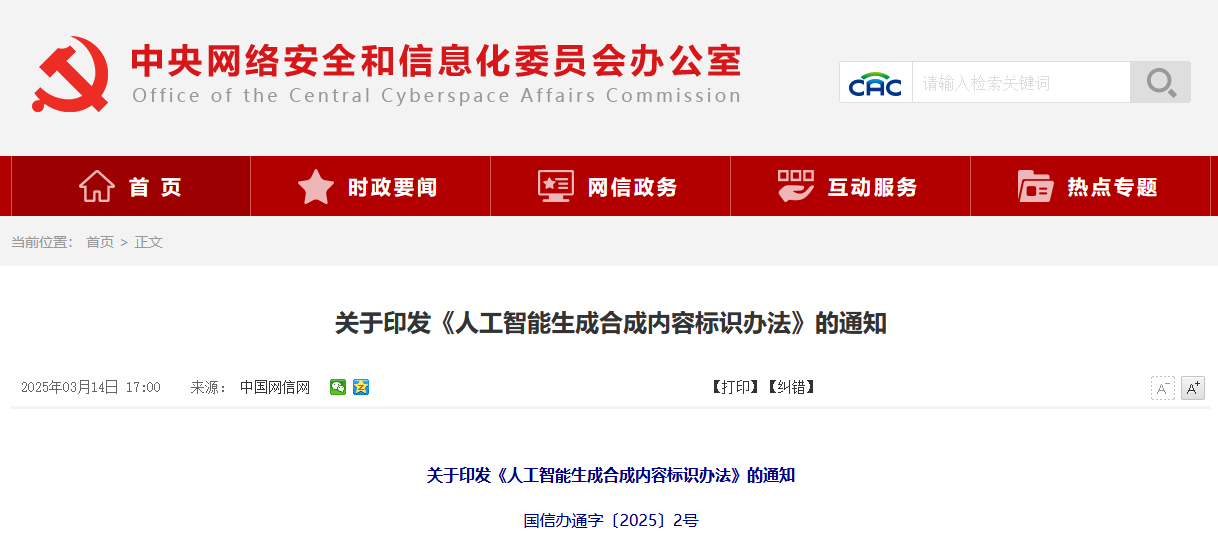 關(guān)于印發(fā)《人工智能生成合成內(nèi)容標(biāo)識辦法》的通知