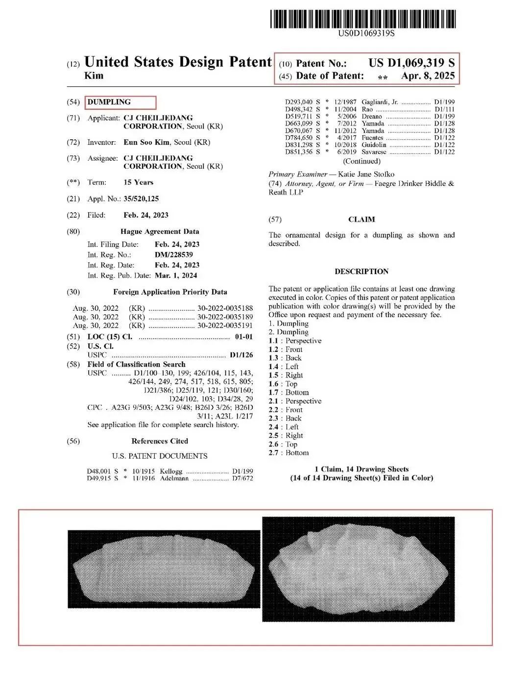 離譜!近日,據(jù)美國專利商標(biāo)局官網(wǎng)顯示:韓國CJ第一制糖股份有限公司(下稱“CJ公司”),在美國注冊的餃子外觀專利獲準(zhǔn)通過,相關(guān)消息引發(fā)關(guān)注 。