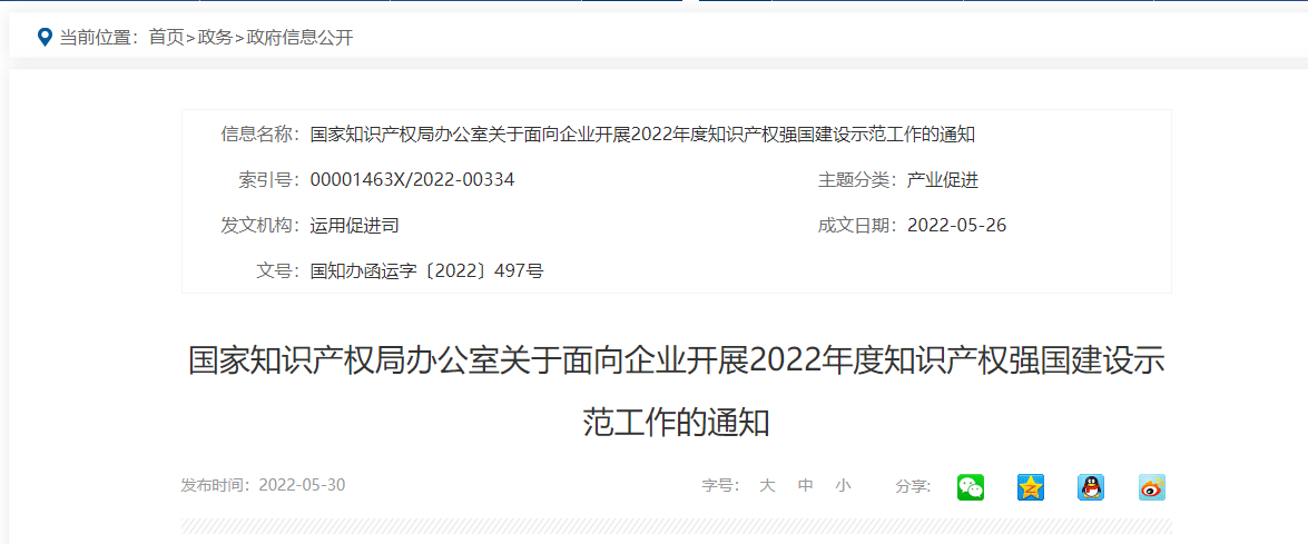 國(guó)家知識(shí)產(chǎn)權(quán)局辦公室關(guān)于面向企業(yè)開展2022年度知識(shí)產(chǎn)權(quán)強(qiáng)國(guó)建設(shè)示范工作的通知